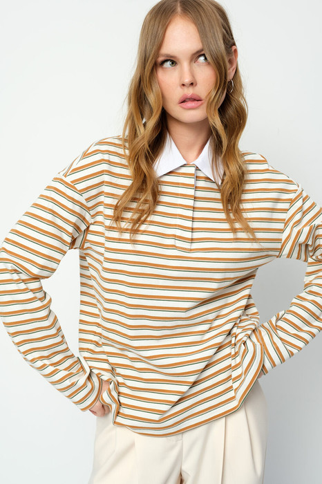 Свободный трикотажный джемпер в полоску с контрастным воротником-поло.