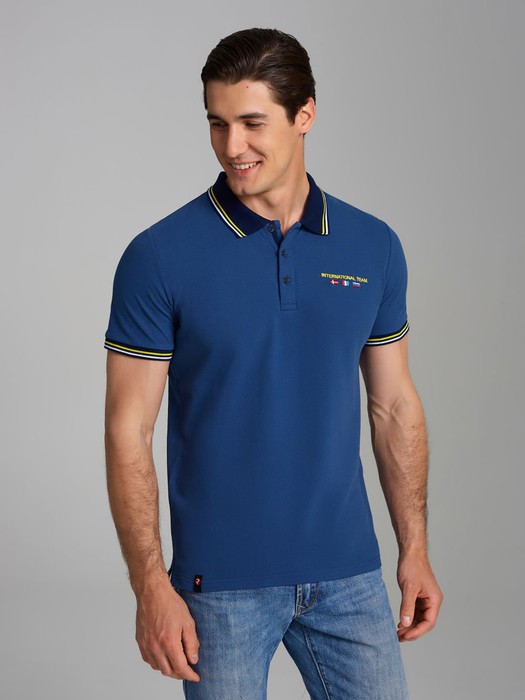 Футболка-поло из хлопкового полотна "пике". Классическая модель поло с короткими рукавами. Воротник и манжеты рукава выполнены из трикотажной рибаны темно-синего цвета с бело-желтой полосой. На полочке застежка-планка на пуговицах. На нижней планке и по горловине настрочена контрастная киперная тесьма. На полочке выполнена вышивка "INTERNATIONAL TEAM" и вышивка флагов. По низу футболки в боковых швах выполнены разрезы, обработанные тесьмой. С правой стороны полочки, по низу настрочен жаккардовый "флажок" с логотипом.