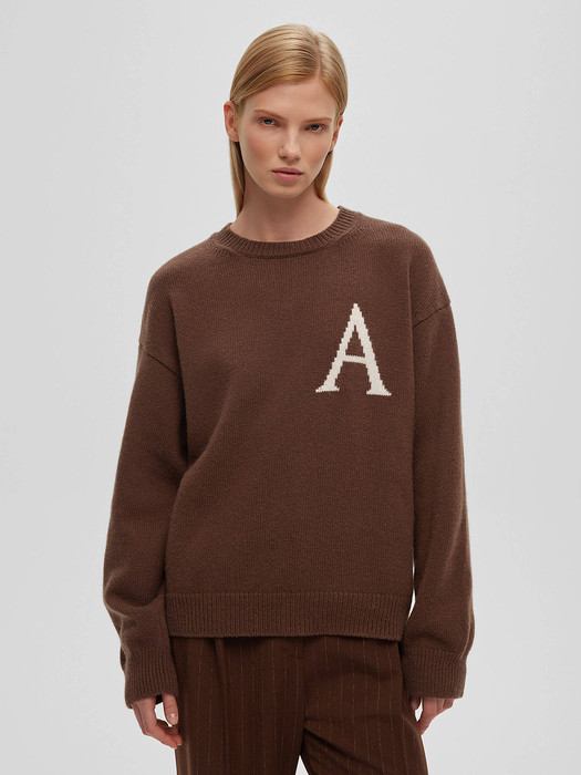 Джемпер свободного кроя с интарсией "А", коричневый