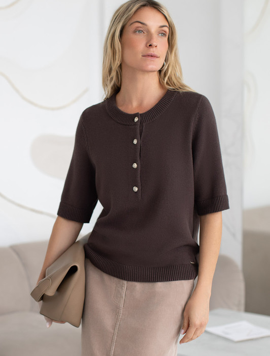 Состав: 70%Хлопок 21%ПА 9%Кашемир Размер товара на первом фото: 42Джемпер тонкой вязки выполнен из хлопка с добавлением кашемира. Модель с круглым вырезом дополнена золотистыми пуговицами. Мягкая и очень приятная пряжа совершенно не колется, сохраняет тепло при этом не перегревая, гарантируя безупречный комфорт.