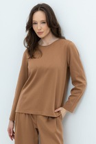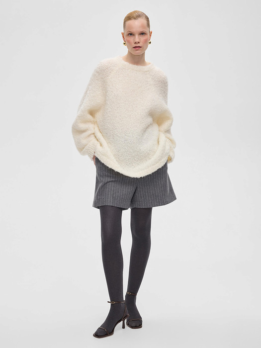 Удлинённый джемпер с круглой горловиной и рукавами реглан выполнен из смесовой пряжи с альпакой и шерстью. Фактура букле формирует живую, объёмную поверхность, которая сразу задаёт характер модели и делает её визуально выразительной.