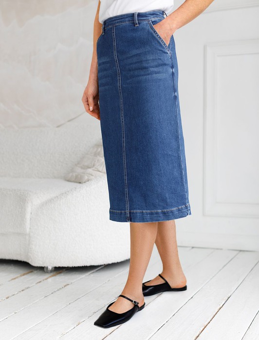 Совместные покупки Челябинск Женская одежда Футболки — Джинсовая юбка прямая с разрезом и декоративной стиркой из эластичного денима