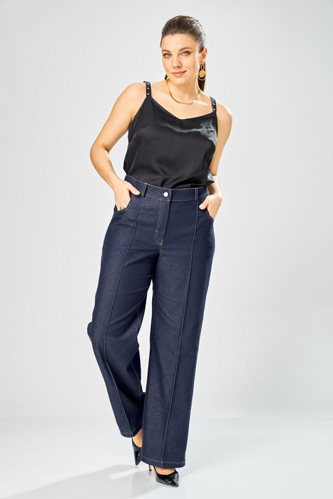 Джинсы прямые от бедра, по переду и задним половинкам застрочены стрелки . По переду на уровне бедер карманы с подрезным бочком, на спинке накладные карманы.