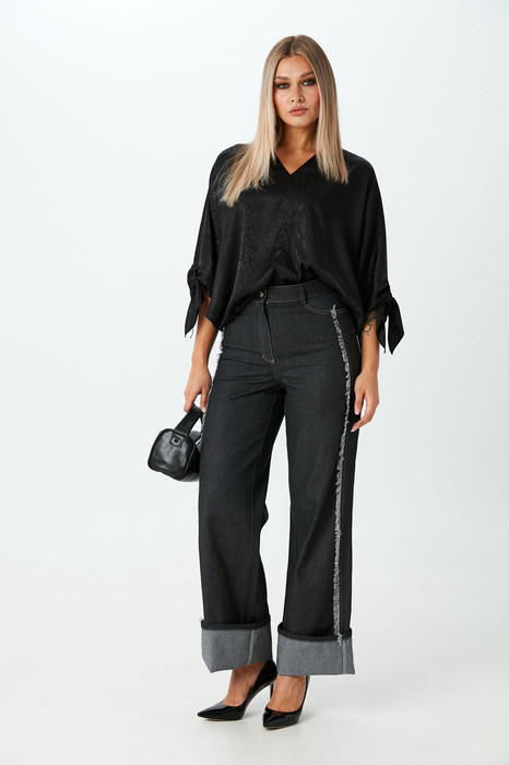 Комфортные плотные брюки из джинсовой ткани свободнго объёма от бедра с подворотами по низу, которые позволяют регулировать длину брюк.