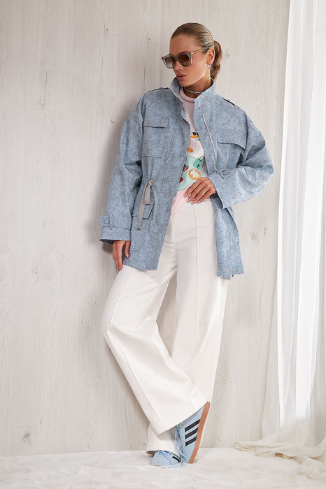Джинсы прямого кроя. Изделие на поясе. Пояс со шлевками для ремня, фигурные карманы   на передних половинках и накладные карманы сзади. На правом заднем кармане брюк авторский флажок. На передних половинках брюк застрочены канты. Брюки можно носить как в отвернутом виде, так и с подвернутом.