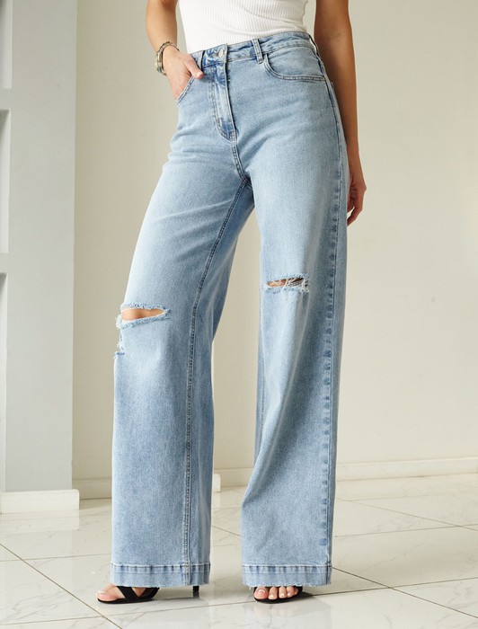 Состав: 70%Хлопок 28%ПЭ 2%ПУ Плотность: 11 OZ Параметры модели на первом фото: Рост 172, бюст 88, талия 64, бедра 88 Размер товара на первом фото: 42Джинсы-трубы в голубом оттенке выполнены из эластичного денима. Модель с эффектной стиркой и трендовыми декоративными рвными элементами. За счет высокой посадки на талии и свободного силуэта, модель вытягивает силуэт, визуально стройнит и подходит для любой фигуры. Изделие дополнено брендированным патчем.