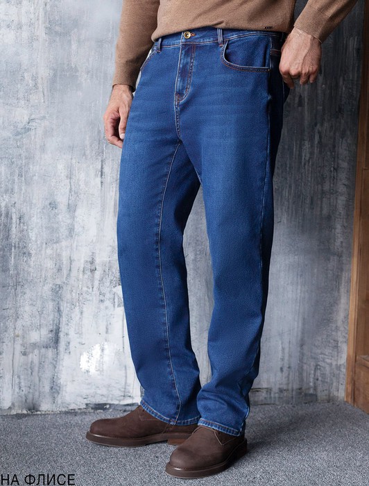 Состав: 65%Хлопок 32%ПЭ 3%ПУ Плотность: 16,6 OZТеплые джинсы синего цвета прямого кроя созданы для мужчин, ценящих комфорт и стиль даже в холодную осень или зиму. Повседневные джинсы выполнены из эластичного денима, легко тянутся и не сковывают движений, обеспечивая правильный баланс между свободой и удобной посадкой Regular Fit. Внутри мягкий флис дарит приятные ощущения, надежно согревают в холодную погоду и делают каждую прогулку максимально комфортной. Свободный классический крой подходит на разныетипы фигур, в том числе и большие размеры. Правильная посадка гарантирует удобство и комфортные ощущения при носке. Джинсы дополнены пятью карманами и брендированным патчем на поясе. Контрастная прострочка и легкая декоративная стирка гармонично сочетаются с классическим цветом джинс, добавляя стильный акцент в образ. Джинсы удобные на все случаи жизни: они сохраняют форму, не деформируются при носке и обеспечивают оптимальную теплоизоляцию. Утепленный материал создает дополнительный уровень защиты от холода, что делает изделие надежным выбором на зиму и осень. Комфортные брюки отлично сочетаются с разными образами благодаря универсальному дизайну. Они подходят тем, кто ценит практичность и стиль без компромиссов по качеству.