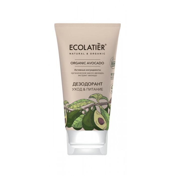 Ecolatier Дезодорант Уход & Питание Organic Avocado на основе натуральных компонентов особенно бережно ухаживает за кожей, защищает от неприятного запаха, дарит легкий аромат, обеспечивает свежесть и комфорт. Не оставляет следов на одежде. Натуральное и безопасное средство. Содержит не менее 97% ингредиентов растительного происхождения.