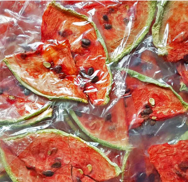 Сушенные ломтики арбуза и ничего кроме арбуза (без сахара и каких-либо других добавок).Высушенный на специализированном оборудовании при низких температурах, арбуз сохраняет практически все свои полезные свойства и витамины. При сушке он усыхает в 20 раз, таким образом, откушав 100 грамм сушенных ломтиков арбуза, вы получаете такое же количество витаминов и полезных веществ, которое содержится в 2 килограммах свежего арбуза.Это отличный вариант перекуса, ведь не везде и всегда можно съесть свежий фрукт. Удобные пакеты с зип лок замком позволяют сохранять свежесть продукта и перекусывать по мере необходимости.Вы даже представить себе не можете насколько вкусными и сладкими могут быть фрукты. Это не просто перекус, но и полезная альтернатива калорийным и не питательным десертам.