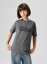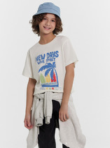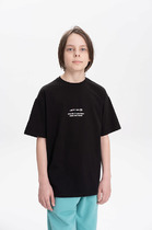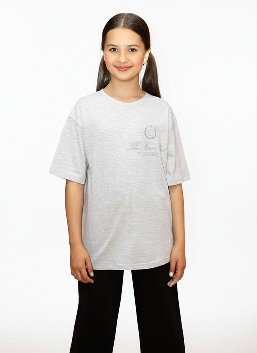 Футболка для девочки из трикотажного полотна "кармеланж" с приспущенным плечом, втачными короткими рукавами, горловиной овальной формы, обработанной втачной планкой и принтом на полочке, выполненным в технике шелкографии. По шву втачивания планки в горловину настрочена отделочная строчка.