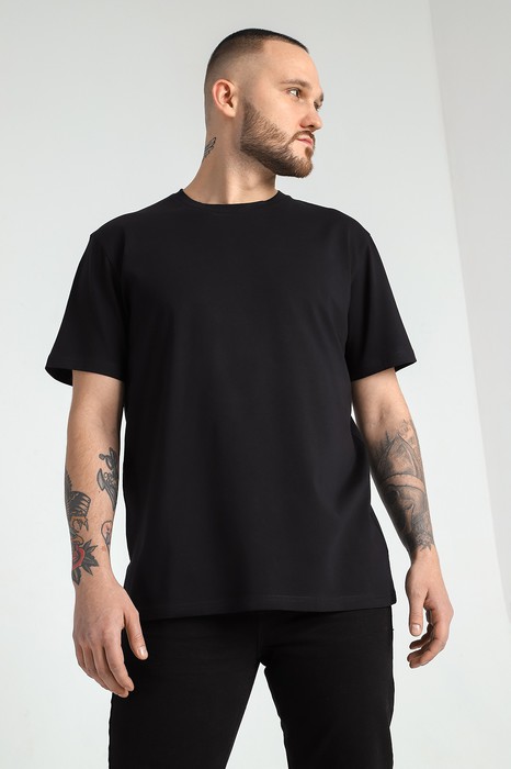 Базовая однотонная мужская футболка прямого силуэта без принта. Выполнена из трикотажного полотна: хлопкового с добавлением лайкры. Горловина округлой формы с усилителем горловины спинки.