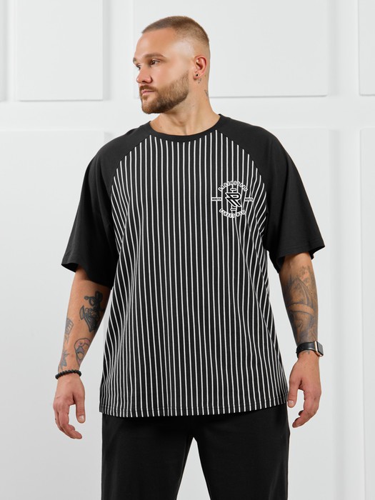 Футболка мужская из трикотажного полотна с набивным рисунком в узкую черно-белую полоску в комбинации с черным однотонным материалом. Модель с короткими рукавами покроя "реглан", горловиной овальной формы, обработанной втачной планкой, и принтом на детали переда.