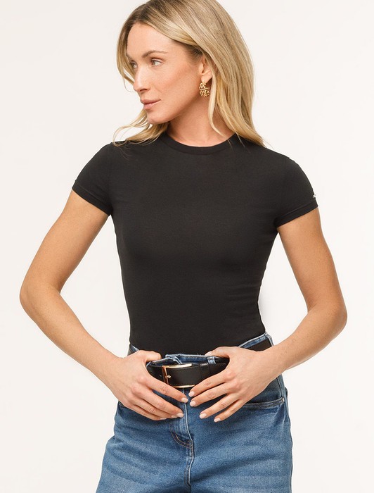 Состав: 92%Хлопок 8%ПУ Плотность: 170 Г/м2 Параметры модели на первом фото: Рост 172, бюст 88, талия 64, бедра 88Футболка выполнена из премиального хлопка, дополнена металлическим логотипом бренда на рукаве.Модель идеально сидит по фигуре не сковывая движения. Хлопковый трикотаж поддерживает оптимальную температуру тела, поэтому в изделии будет комфортно в течении всего дня. Наличие эластана в составе гарантирует формоустойчивость. Базовая модель впишется в повседневные образы и подойдет для офисного дресс-кода.