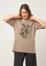 Футболка прямого свободного кроя, выполнена из трикотажного полотна молочного цвета. Характеристика: прямой крой, овальная горловина. Рукав спущен. Спинка цельнокраеная, по переду напечатан принт. Длина спинки 68см, длина рукава от края горловины 41см.