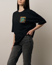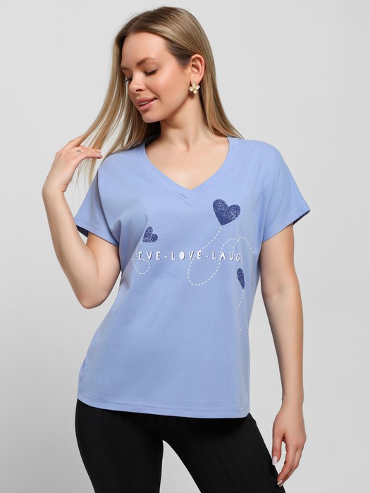Футболка – из гладкокрашеного полотна, с короткими цельнокроеными рукавами, горловиной V-образной формы, обработанной притачной бейкой и принтом на полочке, выполненным в технике шелкографии.