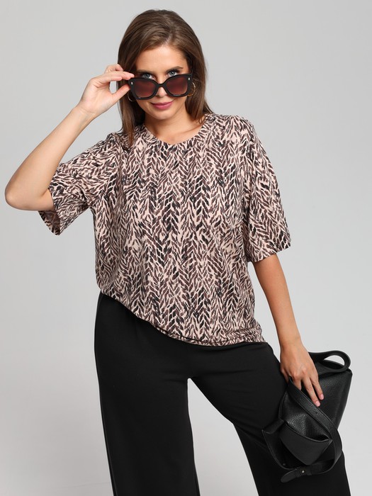 Футболка женская из вискозного трикотажного полотна с набивным рисунком, классического покроя, с горловиной овальной формы, обработанной широкой втачной планкой, с короткими втачными рукавами.