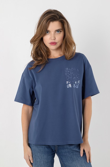 Футболка молодежная из гладкокрашеного трикотажного полотна «кулирка с лайкрой», свободного покроя, с втачными короткими рукавами и вышивкой пайетками на полочке. Горловина овальной формы обработана втачной планкой с отделочной строчкой по шву притачивания.