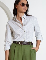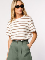 Футболка молодежная их трикотажного полотна кулирка» в полоску, свободная, с втачными рукавами, горловиной овальной формы, обработанной притачной бейкой из основного материала. Полочка и спинка с двумя небольшими косыми кокетками и отделочным кантом в швах соединения кокеток с основными деталями, кант из контрастного материала.