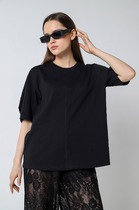 Футболка женская из гладкокрашенного трикотажного полотна «кулирка с лайкрой», свободного покроя, со спущенным плечом и втачными рукавами длиной до локтя, горловиной овальной формы, обработанной втачной планкой. По центру полочки выполнена вышивка «пайетками» в тон изделия. В нижней части боковых швов небольшие разрезы.