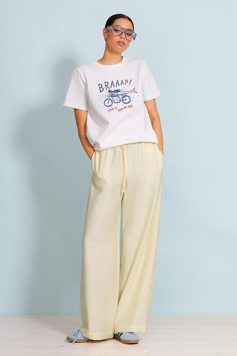 Объемная футболка оверсайз выполнена из плотного хлопкового трикотажного полотна (интерлок). Спущенная линия плеча. Рукав до локтя. Горловина круглая с притачной планкой. Дизайнерский принт “ MOTO” на передней половинке футболки.