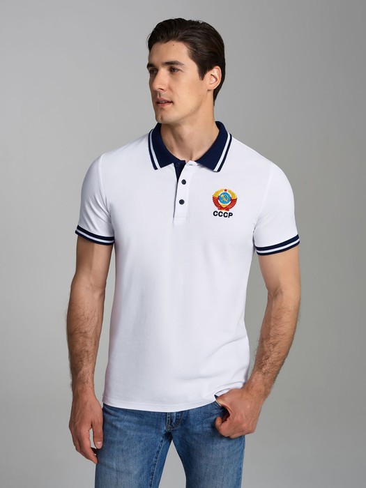 Футболка-поло из хлопкового полотна "пике". Классическая модель поло с короткими рукавами. Воротник и манжеты рукава выполнены из трикотажной рибаны темно-синего цвета с белой полосой. На полочке застежка-планка на пуговицах. На груди вышивка "СССР". По низу футболки в боковых швах выполнены разрезы, обработанные тесьмой.