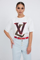 Футболка из трикотажной хлопковой ткани, со спущенным плечом. Перед футболки с принтом. Вырез горловины круглый, оформлен бейкой.В шов втачивания рукава,вставлен валан. Срез валана -не оработан. Спинка со средним швом.