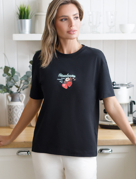 Особое внимание привлекает стильный принт в виде клубники с минималистичной надписью. Перевод надписи: Strawberries sweet summer days - Клубничные сладкие летние дни. Принт выполненны красками с устойчивым покрытием, который добавляет изделию оригинальности и позволяет выразить индивидуальность.