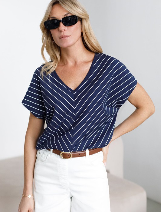 Состав: 92%Хлопок 8%ПУ Плотность: 170 Г/м2Футболка темно-синего цвета в беую полоску выполнена из гладкого эластичного хлопка плотностью 170 Г/м2. Модель с цельнокроеным рукавом, который гарантирует свободу движений, что особенно актуально для активного образа жизни. V-вырез подчеркивают геометрично соединенные полосы. В отличии от классической горизонтальной полоски, такой орнамент стройнит, вытягивает силуэт и придает образу эффектности. Свободная футболка подходит любому типу фигуры, в том числе и на большие размеры. Приятный к телу хлопок не вызывает раздражения и подходит для ежедневной носки. Сочетание гладкой текстуры и эластичных свойств позволяет футболке выглядеть аккуратно и стильно даже после множества стирок. Легкая футболка сочетается с базовыми элементами одежды, позволяет создавать различные повседневные или яркие образы.