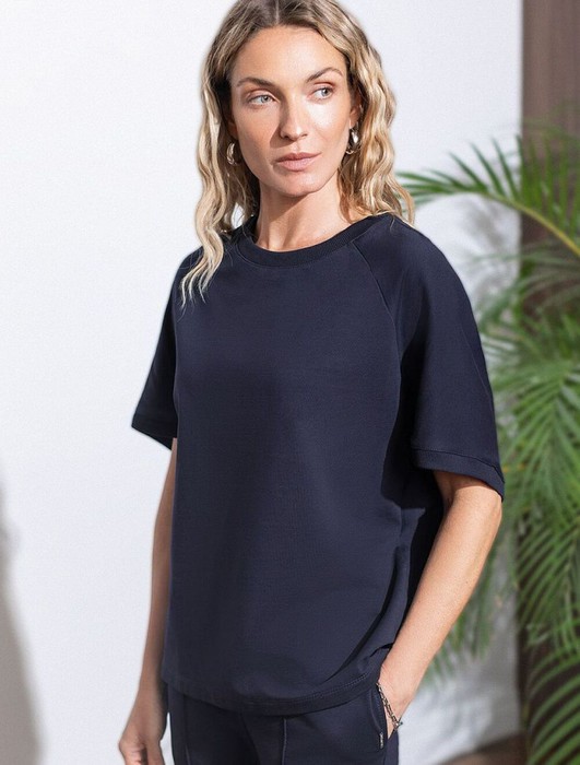 Футболка с рукавами регланами выполнена из эластичного футера двухнитки. Свободная модель со спущенной линией плеча легко поможет составить образы в расслабленном стиле. Сочетается в костюме с брюками D44.135, D44.136 и юбкой D46.034. Наличие эластана в составе изделия гарантирует абсолютный комфорт и формоустойчивость.