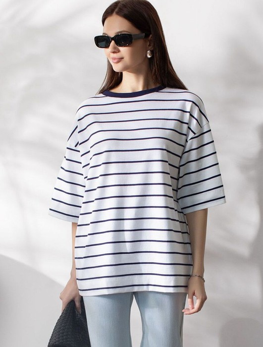 Стильная и модная женская футболка белого цвета в синюю полоску станет отличным дополнением к вашему гардеробу. Футболка плотностью 170 Г/м2 изготовлена из премиального хлопка с добавлением эластана. Добавление эластана в состав изделия способствует формоустойчивости. Эта классическая футболка свободногокроя подходит для создания кэжуал образа на каждый день и идеально подойдет для работы. Модель не мнется, что делает ее практичным вариантом для активных женщин, которые ценят стиль и удобство. Благодаря современному принту полоска эта футболка легко комбинируется с различными элементами гардероба. Она станет универсальным решением для тех, кто предпочитает комфортный стиль casual. Повседневная футболка подчеркнет вашу индивидуальность и позволит вам выглядеть привлекательно в любой ситуации. Легкость в уходе и высокая износостойкость делают ее незаменимой вещью в вашем гардеробе. Одевайте эту модель как на работу, так и на встречу с друзьями — она всегда будет уместна! Стильная и практичная модель с простым
