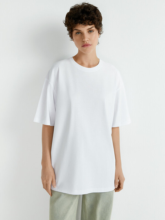 Женская футболка OVERSIZE свободного кроя с удлиненной линией плеча и коротким рукавом. Круглая горловина выполнена из трикотажного материала рибана в стиле «английская резинка». Длина изделия чуть ниже линии бедер.