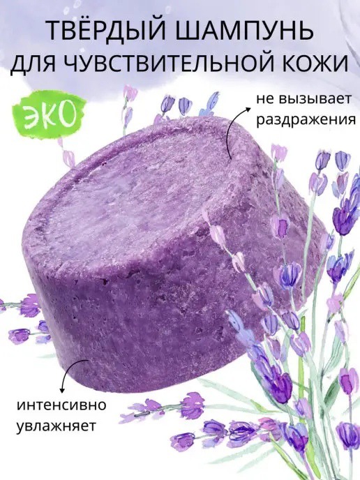 Твердый натуральный шампунь Лаванда, интенсивное увлажнение и блеск, для всех типов волос и чувствительной кожи головы.