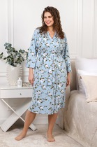 Халат на планке с пуговицами, с коротким рукавом. Длина чуть выше колена. Манжеты рукавов и карман украшены ажурным кружевом.