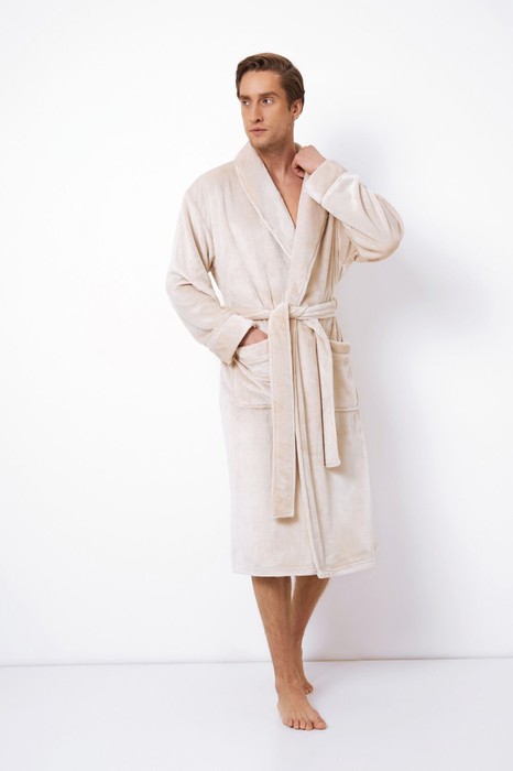 Халат мужской до колен, с поясом на запах, с двумя накладными карманами.