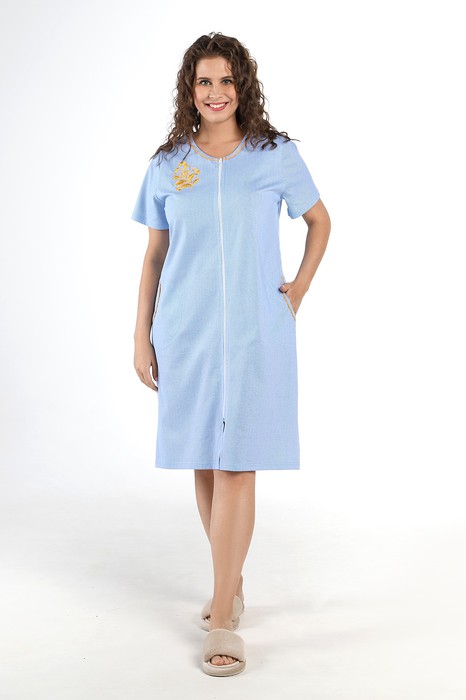Халат из трикотажного полотна «кулирка» с набивным рисунком в полоску, прямого силуэта, с короткими втачными рукавами, горловиной овальной формы, карманами в боковых швах и центральной бортовой застежкой на тесьму «молния». Горловина и входы в карманы окантованы двойным кантом.