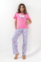 Халат из гладкокрашеного трикотажного вискозного полотна, на запахе, с втачными рукавами 3/4 длины, кружевными манжетами, притачной планкой по бортовым срезам и съемным поясом, продетым через две шлевки в боковых швах. Спинка с кружевной притачной кокеткой - V-образной формы, бортовая планка с кружевными вставками, переходящими на полочку.