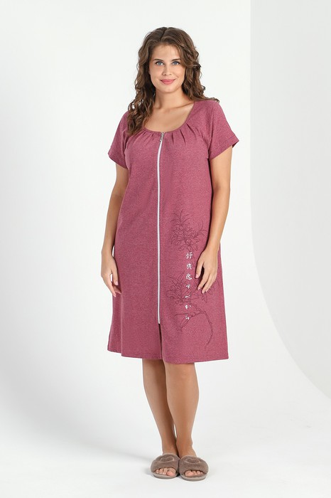 Халат женский из гладкокрашенного трикотажно полотна «кулирка» с меланжированным эффектом. Полуприталенного силуэта, с короткими рукавами покроя «реглан» и горловиной овальной формы, окантованной основным материалом, с центральной бортовой застежкой на тесьму «молния». По срезу горловины выполнены неглубокие складки, нижние резы рукавов обработаны притачными манжетами. На полочке принт, выполненный в технике «шелкографии».