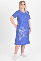 Халат из кулирки с рукавами чуть ниже локтя. На кнопках, низ и края рукавов отделаны белой оборкой. Две цветовых вариации — темно-синяя и бордовая. Размерный ряд от 44 до 54. Возможно приобретение в розницу.