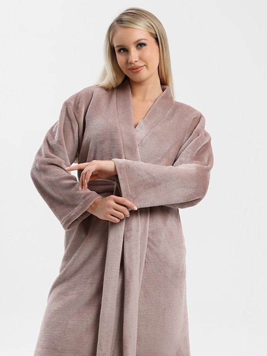 Халат молодежный из гладкокрашенного тканого полотна «велсофт», свободного покроя на «запахе», с длинными втачными рукавами, с притачной планкой по горловине и бортовым срезам, карманами в боковых швах, и декоративной нашивкой на спинке. Съемный завязывающийся пояс, продет в две шлевки в боковых швах на уровне талии.