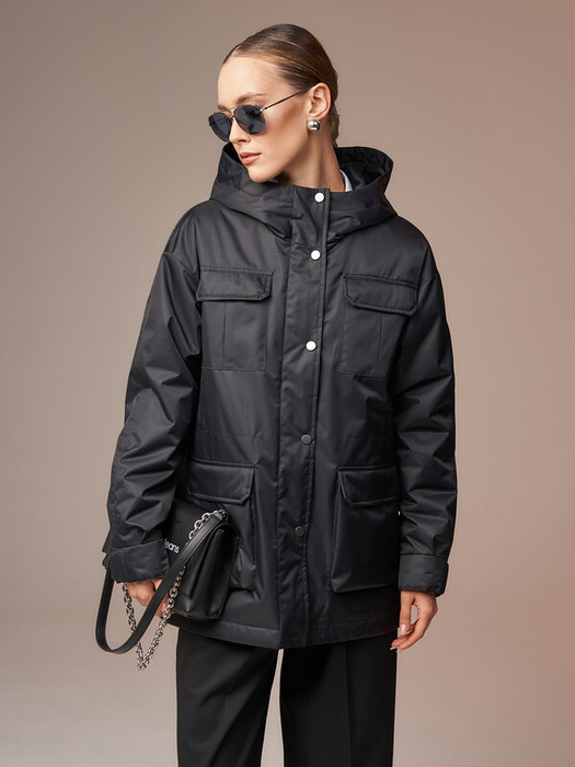 Утепленный плащ с застежкой на молнию и кнопки. Карманы настрочные с декоративными клапанами.