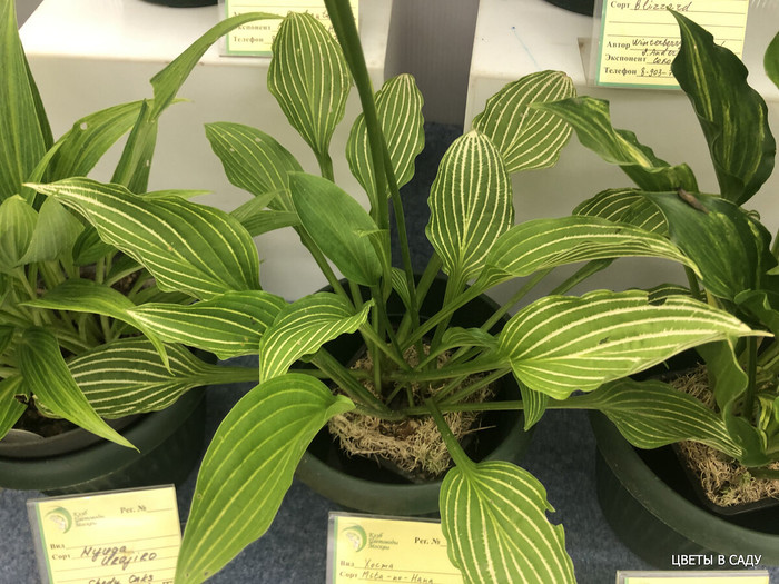 полосатая хоста с вертикальной формой роста, лист удлиненный с частыми желтыми полосами, к середине лета хоста зеленеет Н-35см 50см