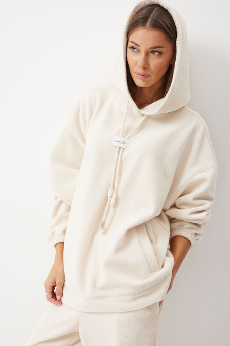 Джемпер прямого силуэта из комфортного трикотажного полотна. Горловина обработана капюшоном. Рукав со спущенной линией плеча, по низу на резинке. По низу джемпера притачной пояс. По переду декоративная нашивка и шнур. Обращаем ваше внимание, что фурнитура может отличаться от фото.