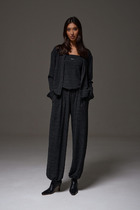 Выполненный в сером цвете, он имеет фактурную ткань и широкие бретели.