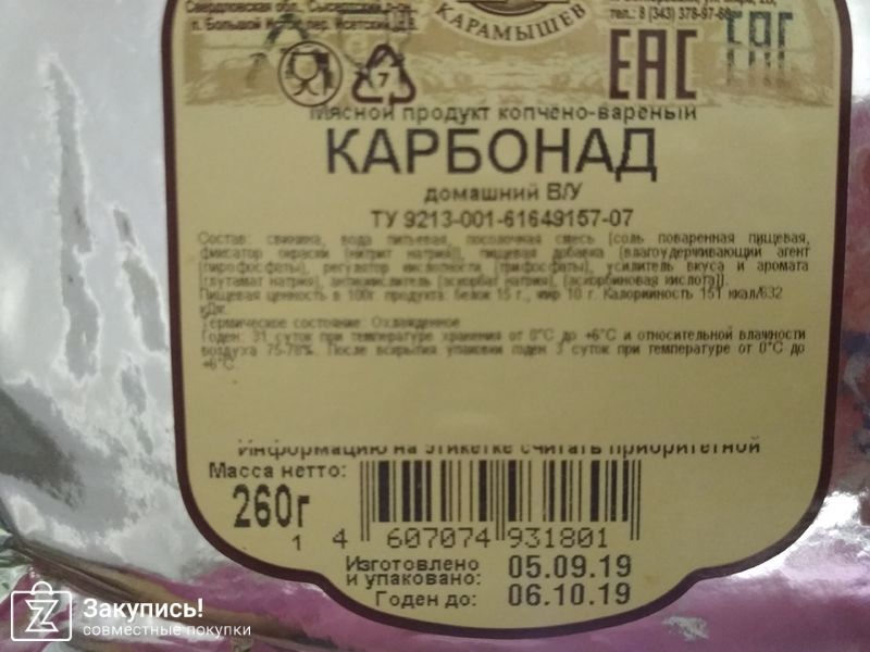 Совместные покупки Челябинск Продукты Колбасы — Карбонад варено-копченый "Домашний" в/у