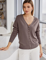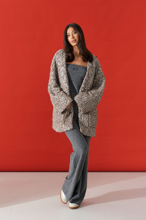 Жакет (кардиган) прямого свободного кроя. Выполнен из мягкой фактурной ткани тёмного-бежевого цвета с серебристым напылением. С подкладкой. Вырез горловины V-образный. Рукав втачной, спущен. По переду накладные карманы. Застёжка центральная пуговицы. Длина спинки 80 см. Длина рукава от линии втачивания 52 см (длина рукава от горловины 79 см)