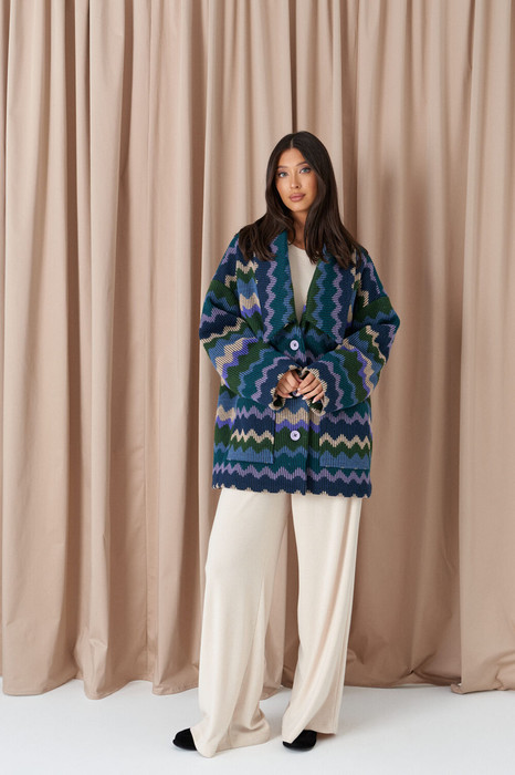Жакет прямого свободного кроя, выполнен из полотна трикотажа крупной вязки. Характеристика: жакет прямого кроя, отложной воротник, центральная застежка на петли-пуговицы, по переду изделия два накладных кармана,брендированная подкладка, рукав свободный, линия плеча спущена, спинка цельнокройная. Длина рукава от края горловины 76см, длина изделия по спинке о края горловины 81см.