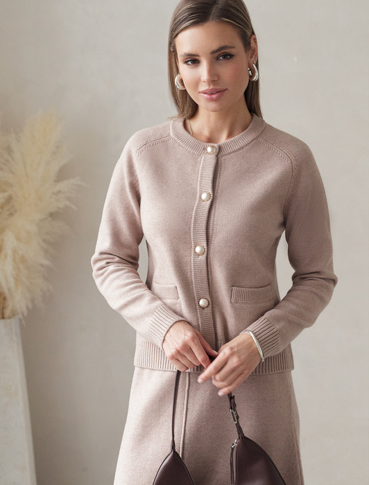Состав: 52%ПАН (акрил) 33%ПЭ 8%ПУ 7%Кашемир Размер товара на первом фото: 42Кардиган выполнен из мягкой меланжевой пряжи с добавлением кашемира. Модель прямого силуэта гармонично впишется в любой образ с брюками, юбками и джинсами. Застежка на пуговицы в жемчужно-золотистом оттенке. Изделие очень приятное к телу, совершенно не колется и отлично сохраняет тепло. Сочетается в костюме с брюками D38.013, D38.012 и юбкой D36.016