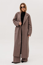 Кардиган свободного прямого силуэта длиной макси. Изделие со съемным поясом  и накладными карманами. Рукав втачной, двухшовный, пройма приспущена. Воротник английский. Застежка не предусмотрена. В боковых швах разрезы.
