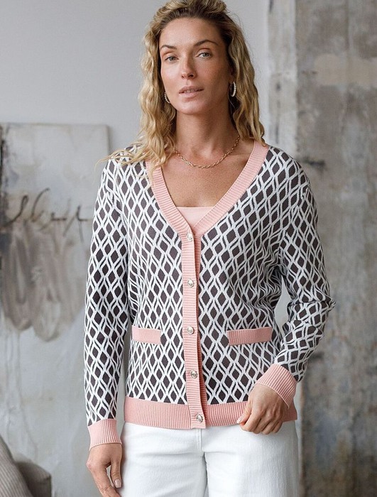 Кардиган с V-вырезом жаккардовой вязки — универсальная и женственная вещь для весны и лета. Бело-черный жакет выполнен из приятной к телу вискозы, отличается в меру свободным кроем, который подчеркивает силуэт. V-вырез подчеркивает зону декольте и визуально вытягивает шею, делая фигуру более изящной. Спущенная линия плеча создает расслабленный силуэт, добавляя комфорта и свободы движений, что отлично подойдет для девушек и женщин плюс сайз размеров. Модель на пуговицах обеспечивает удобство в носке и добавляет классическую нотку образу. Контрастная отделка гармонично сочетается с выразительным геометрическим рисунком, который придает образу индивидуальность и современность. Принт немного напоминает благородный орнамент аргайл, Карманы-обманки украшают, сохраняя лаконичность внешнего вида, Кардиган средней длины оптимален для создания разных комбинаций на каждый день. Такой жакет легко впишется в офисный или повседневный образ благодаря своей универсальности и современному стилю. Вискоза дарит ощущение ком