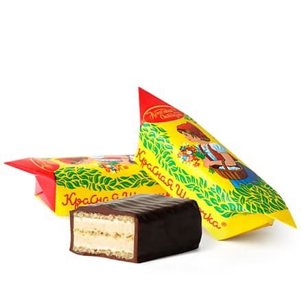 Знаменитые на весь мир конфеты «Красная Шапочка» от фабрики «Красный Октябрь». Знакомый каждому, даже не большому любителю сладостей желтый фантик со сказочной девочкой, внутри него – несколько слоев хрустящих тонких вафель, прослоенных ароматным пралине и покрытых волнистой шоколадной глазурью. Вкус и аромат, знакомые с детства!
